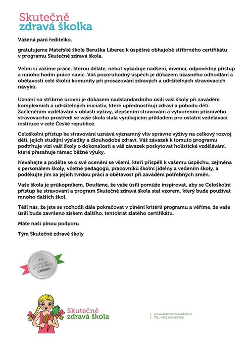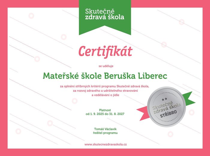 Úvod > Aktuality > Stříbrný certifikát - ,,Skutečně zdravá škola"